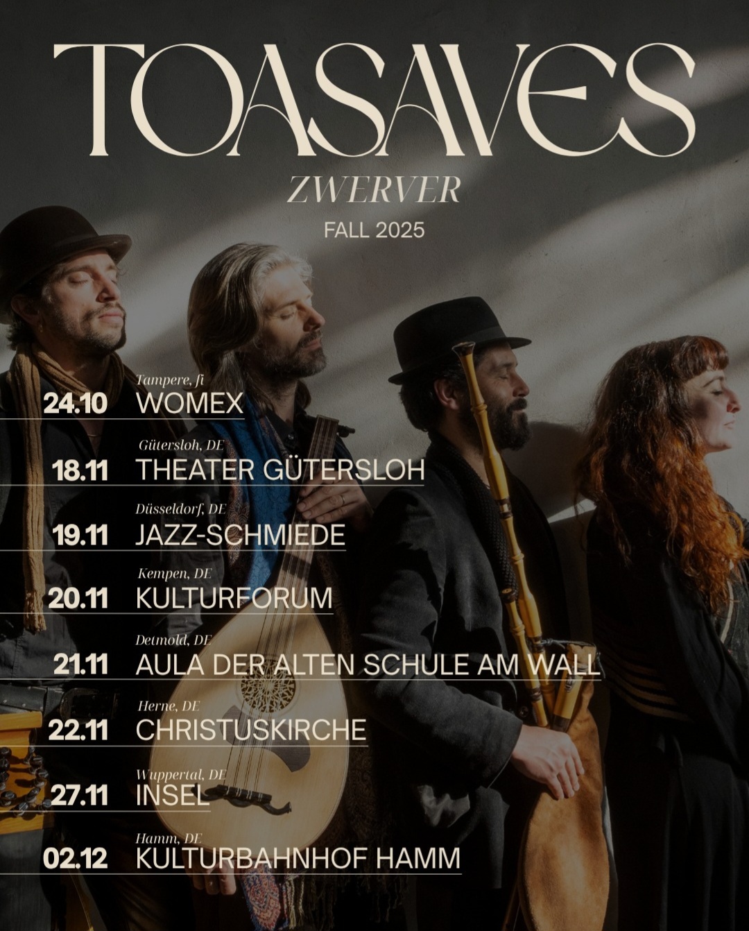 The ensemble is ready to bring their unique sound to international audiences. This fall, Toasaves will take Zwerver on tour, first performing in WOMEX and then bringing their unique cross-cultural dialogue to audiences across Germany with a Klangkosmos tour. Each concert is an invitation to travel through time, borders, and into the heart of shared musical memory.